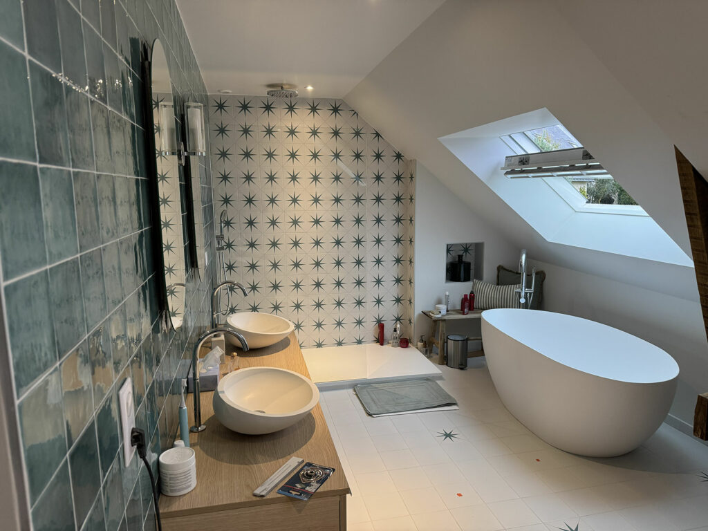 Vachery Carrelages est intervenu à Carnac, dans le Morbihan, pour la rénovation complète d’une salle de bain. Les clients souhaitaient un espace à la fois fonctionnel et original, avec une ambiance marquée et une forte personnalité