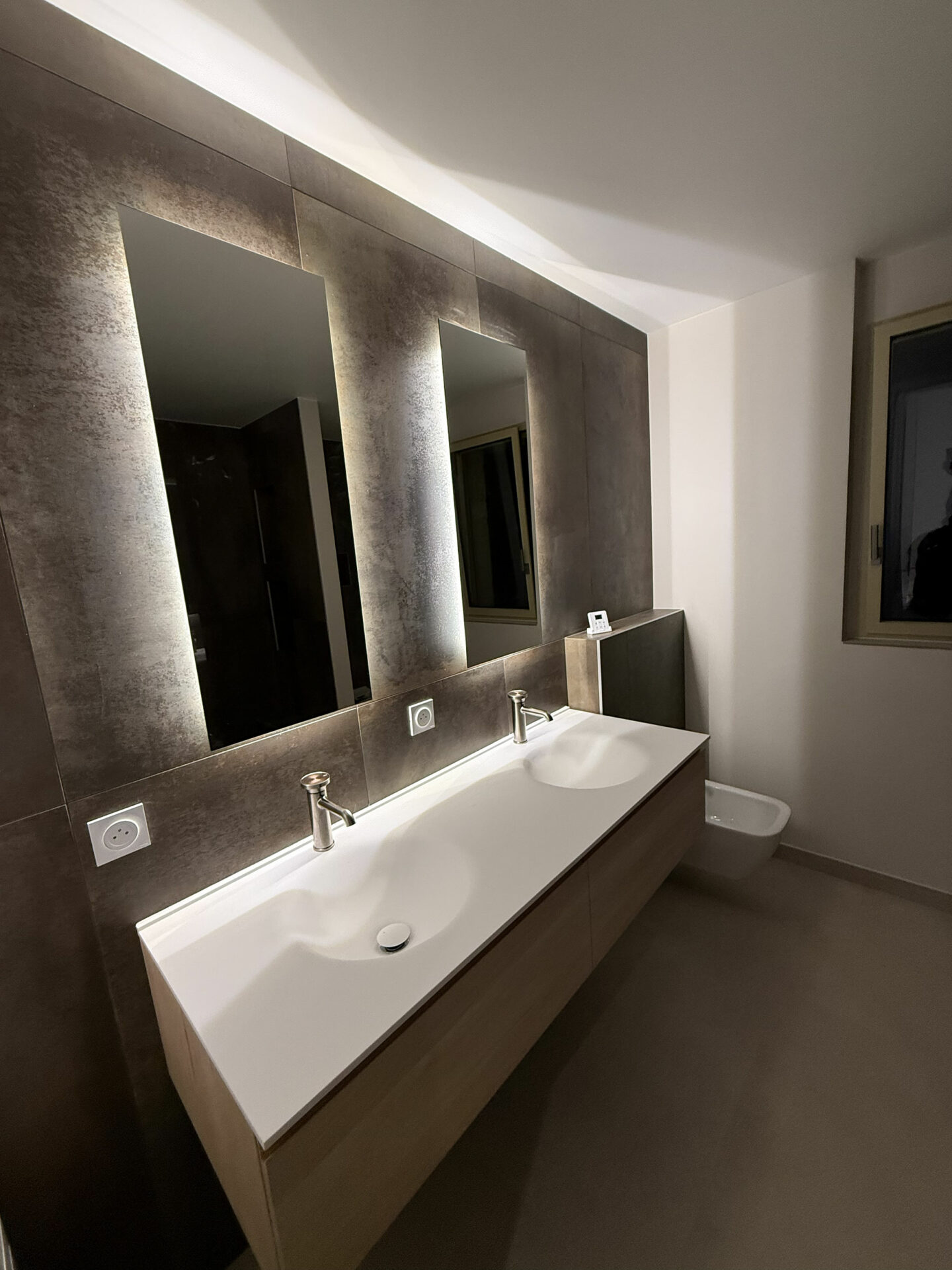 L’arrière du WC suspendu a été habillé avec le même carrelage afin d’assurer une cohérence esthétique dans l’ensemble de la pièce. Ce type d’aménagement permet à la fois de souligner les volumes, de faciliter l’entretien et d’apporter une touche décorative forte à un élément souvent discret. Chaque détail a été pensé pour conjuguer design et fonctionnalité.