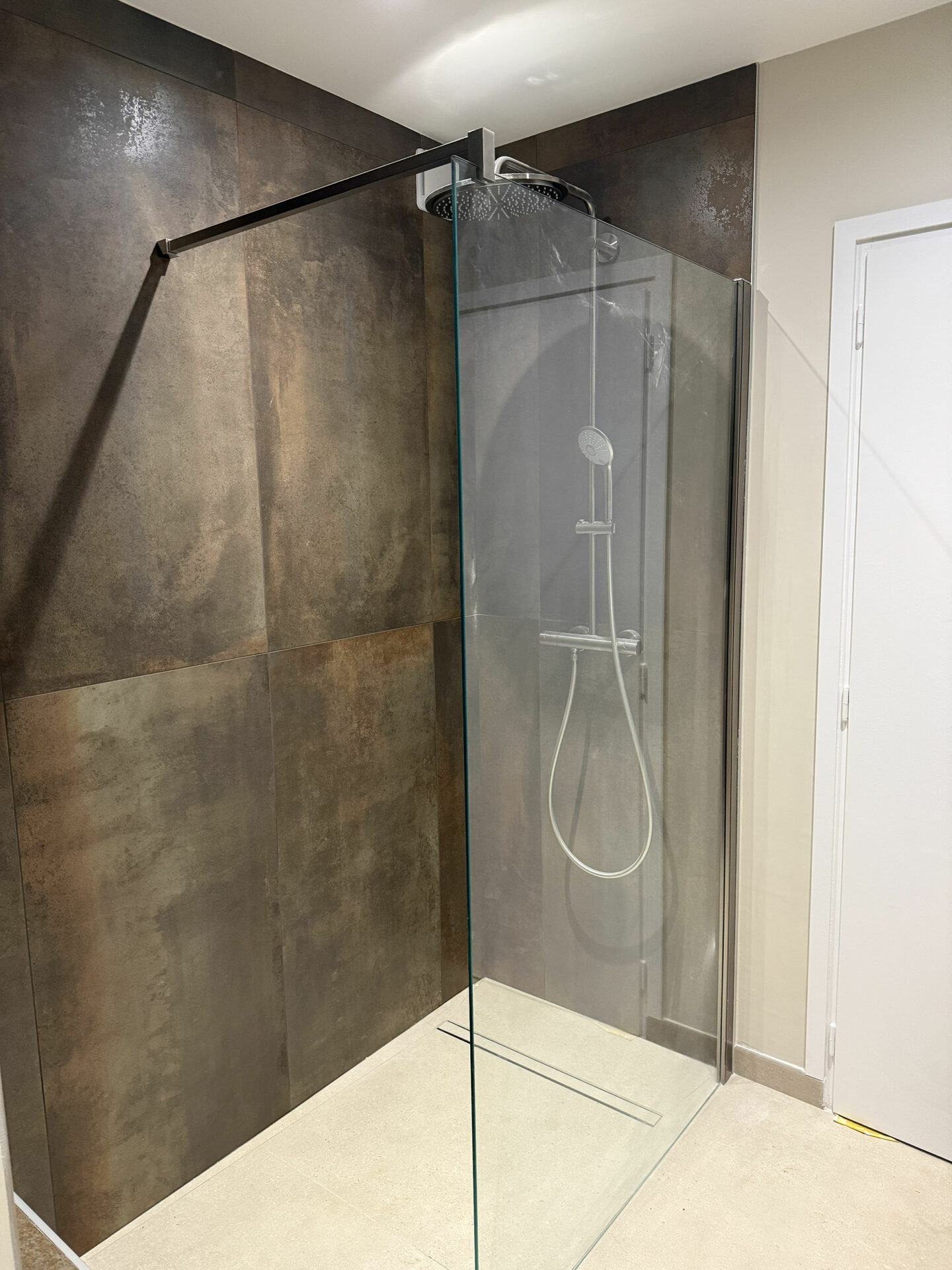 Le choix s’est porté sur un carrelage grand format 60×120, dans une teinte marron élégante, idéal pour structurer l’espace et créer une atmosphère raffinée. Ce format allongé permet de donner une impression de volume et de continuité visuelle, particulièrement appréciée dans les salles de bain modernes. La pose a été réalisée avec une grande précision afin d’assurer un alignement parfait et un rendu soigné.
